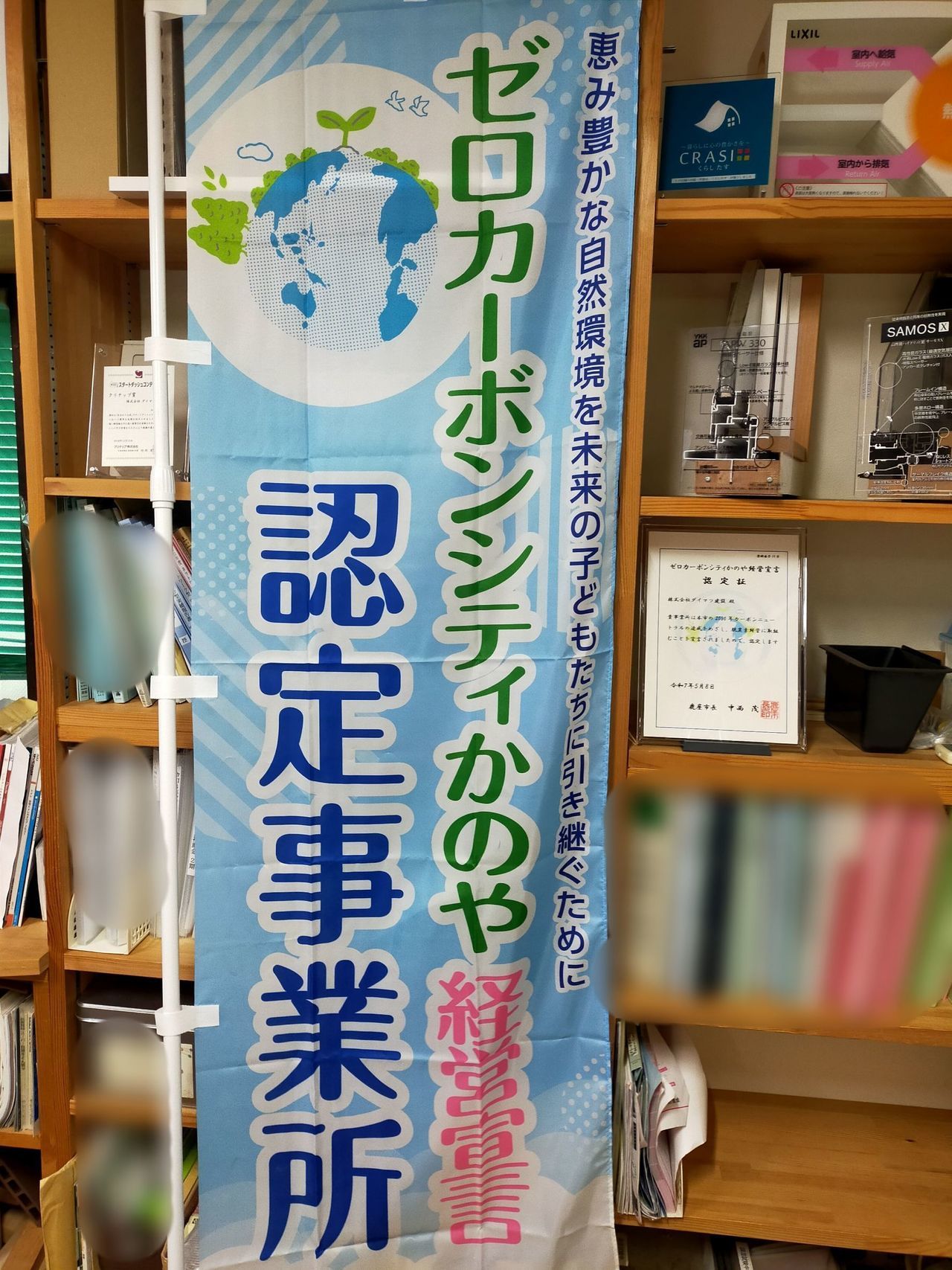 弊社は以前より国の住宅省エネ支援事業者として登録しており、対象になりそうなお客様には各補助金を活用して、エコキュートや太陽光発電システムの設置工事をさせて頂いているので、「せっかくだから、ゼロカーボンシティかのや営業宣言事業所に申請してみよう」というスタッフの提案で申請したところ、無事、認定して頂けてこのような立派な認定証やのぼり等を頂くだけでもありがたいのに、なんと登録事業者として掲載して下さるだけでなく、弊社のHPにリンクするようにまで設定して下さっていました♪ありがとうございます<(_ _)>
