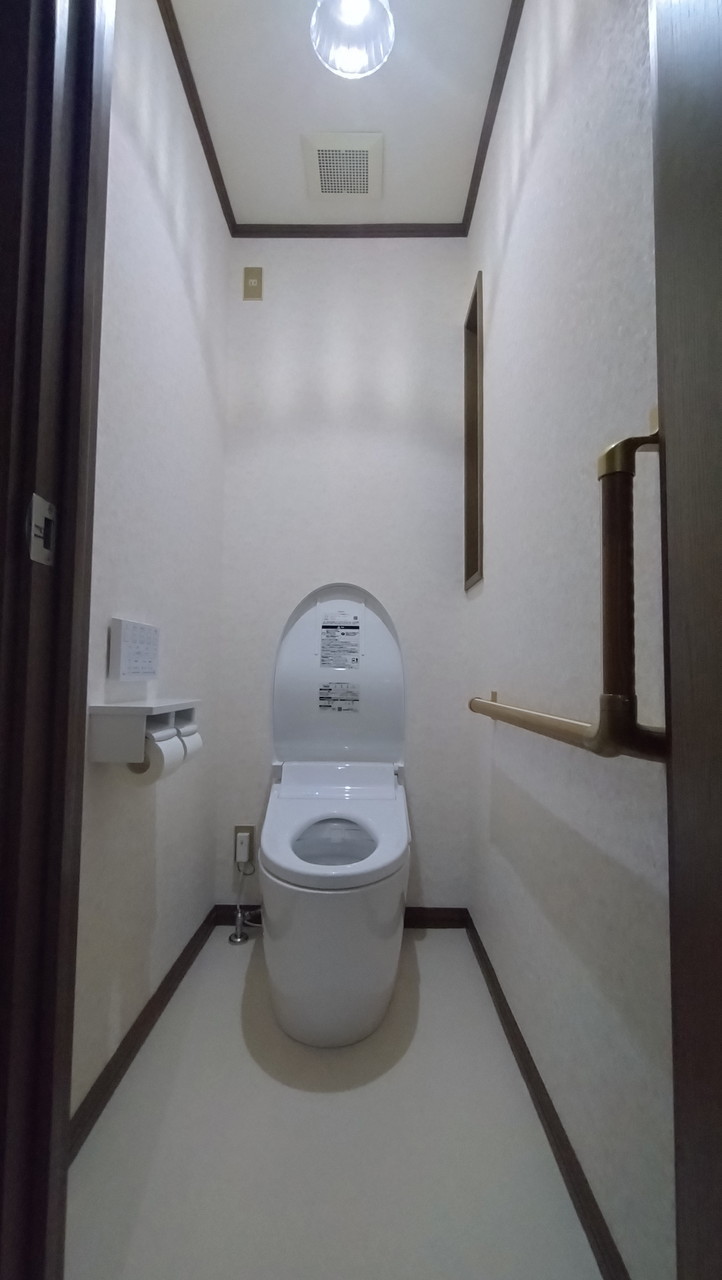 お家の中の荷物のうち、「これは、あそこに……。」とイメージされていたので、棚板もイメージ通りの高さへ設置させて頂き、トイレの空間は同系色でまとめたことで、明るくて圧迫感がない空間に変身しました。